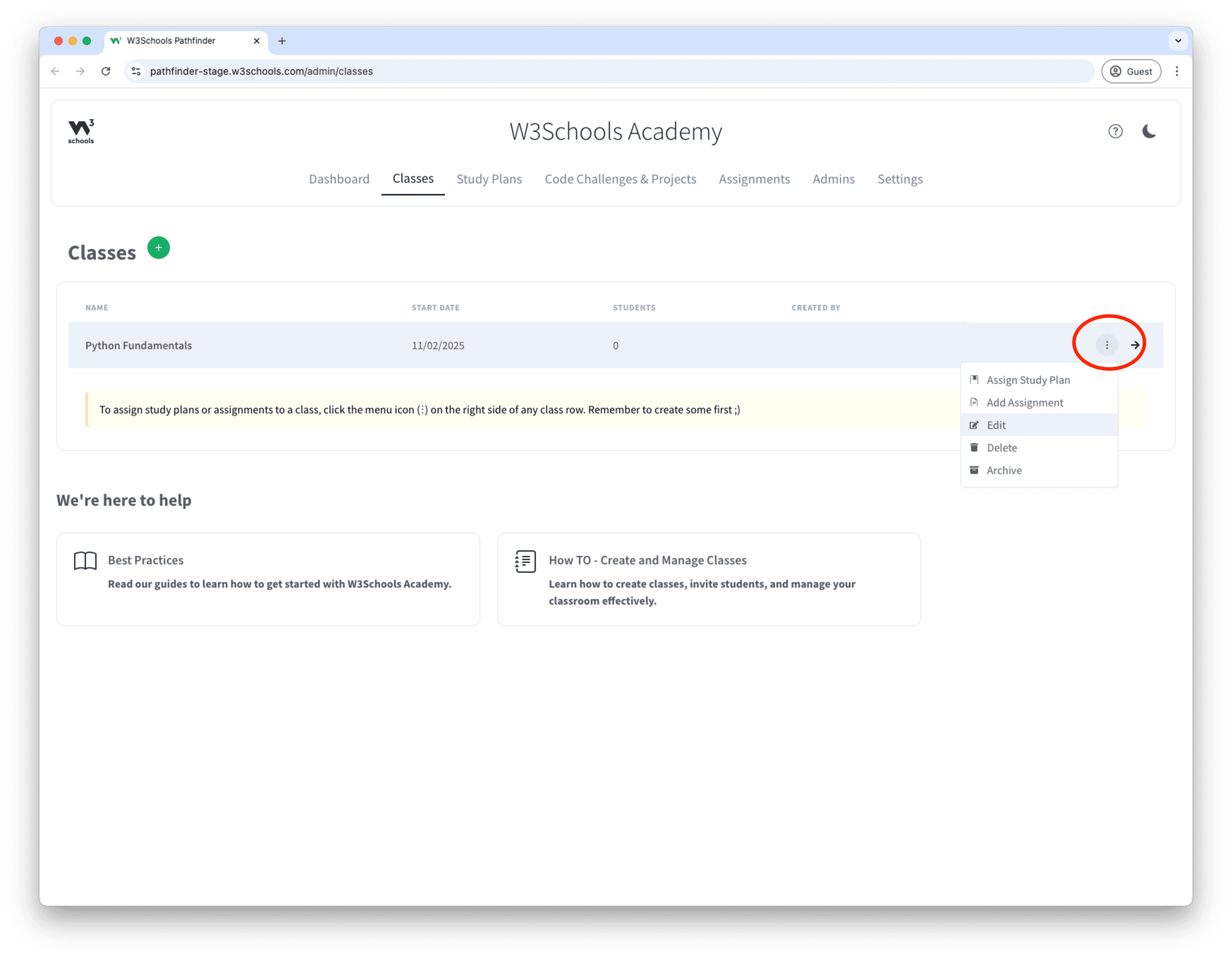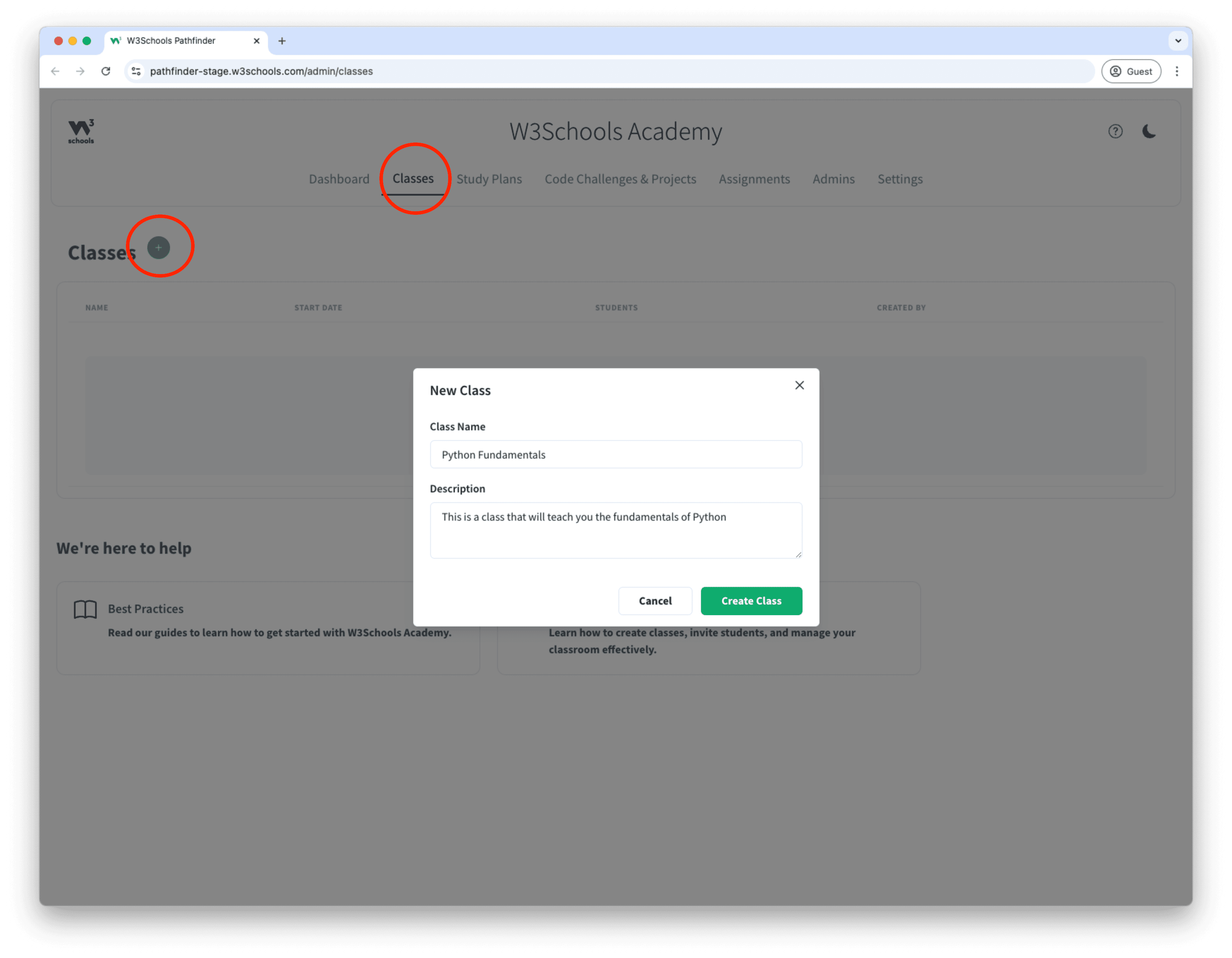 W3Schools Academy allows you to create classes.