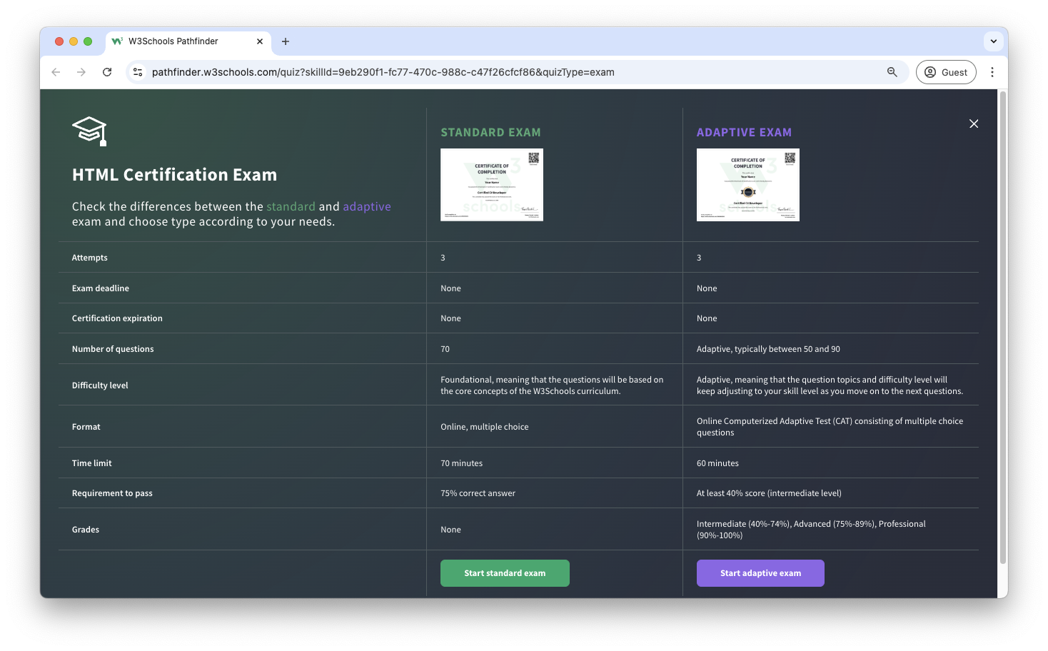 The exam is a test that summarizes the W3Schools syllabus for the different programming languages.