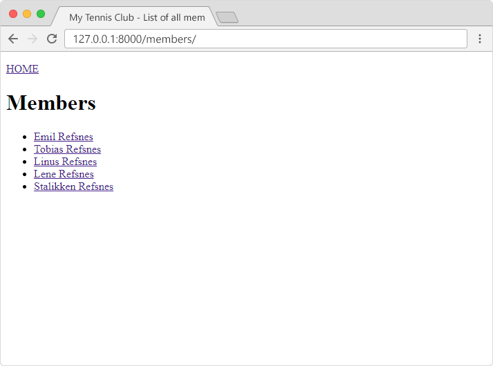 ThThe My Tennis Club project already has a stylesheet, remove it and the Members page without styling will look like this: