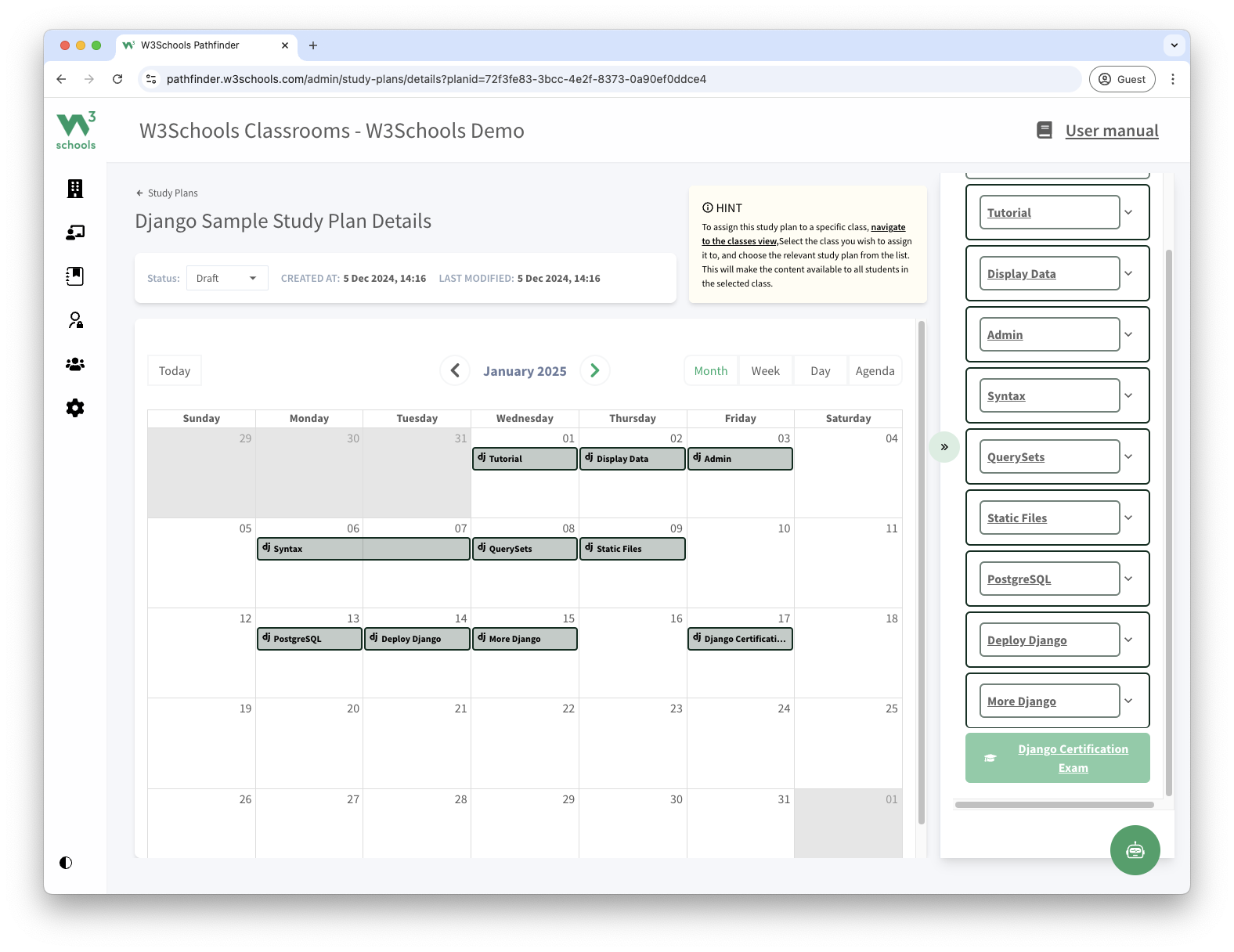 Save time with pre-built teacher materials and study plans. Easily organize your class with a timeline from the introduction of Django to the final exam.