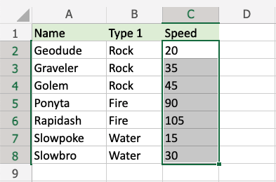 Highlight the Speed values of each Pokemon with Color Scale conditional formatting.