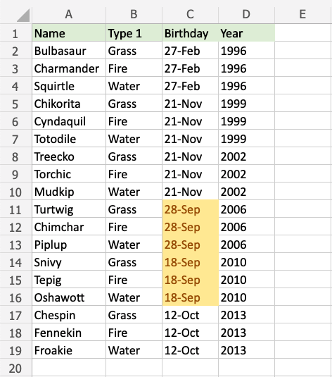 Turtwig, Chimchar, Piplup, Snivy, Tepig, and Oshawott all have birthdays in September, so their cells are highlighted.