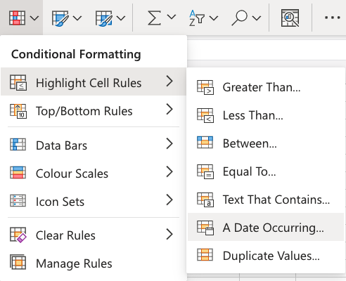 Here is the Highlight Cell Rules part of the conditional formatting menu: