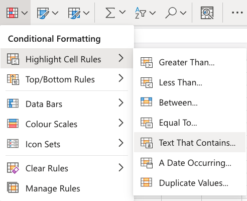Here is the Highlight Cell Rules part of the conditional formatting menu: