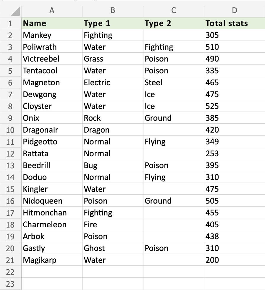 Apply the =COUNT function to range D2:D21. Counting the cells of Pokemon Total stats, which is numbers only: