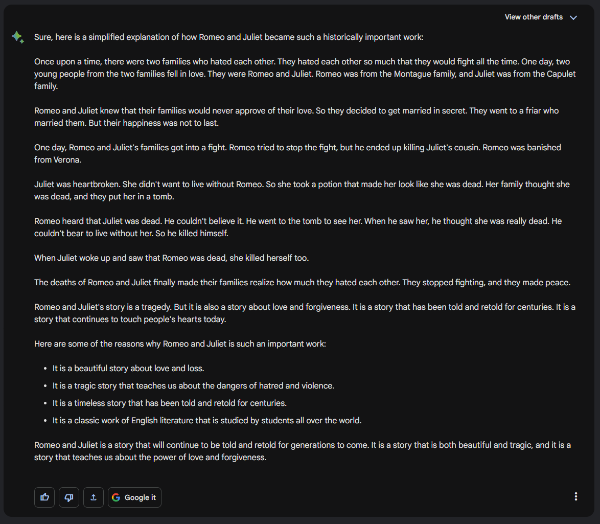 Explain to a 5-year-old how "Romeo and Juliet" written by "William Shakespeare" became such a historically important work. The explanation should be no more than 3 paragraphs.