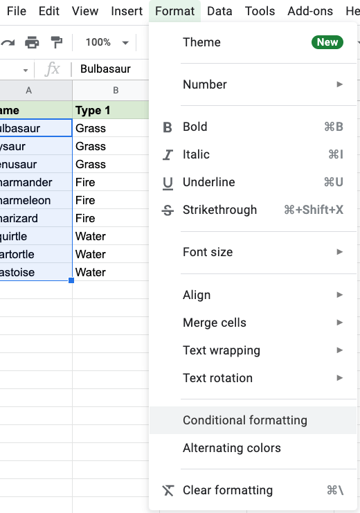 The Conditional Formatting menu will appear in the right-hand side of the spreadsheet: