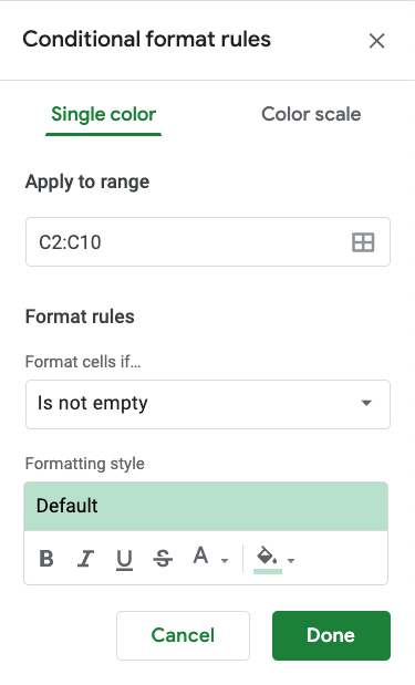 Single Color is a premade type of conditional formatting in Google Sheets used to apply a customizable formatting option to all the cells that match a condition.