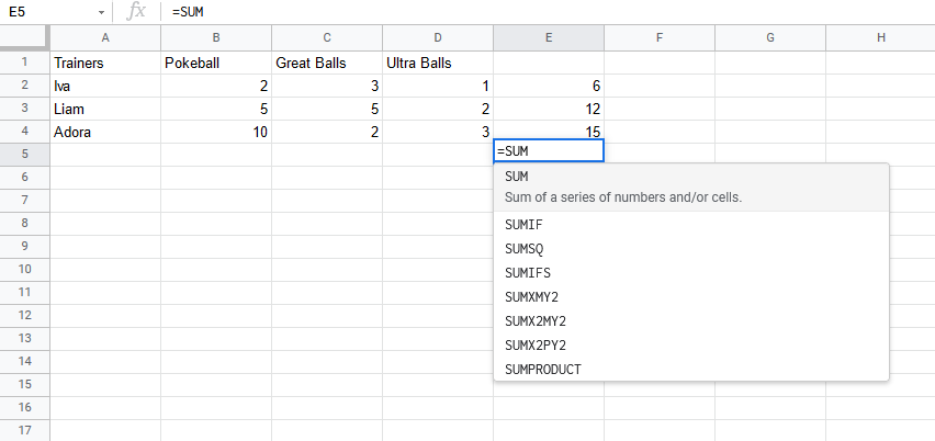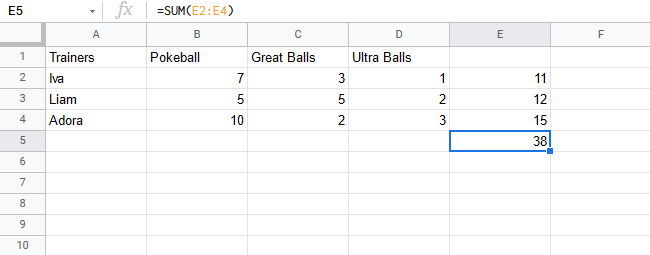 Let's help Iva to count her Pokeballs. You find Iva in A2(Iva). The values in row 2 B2(2), C2(3), D2(1) belong to her.