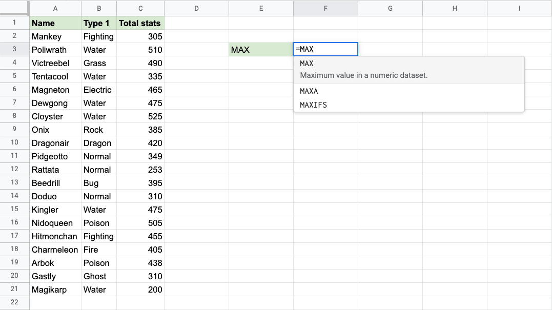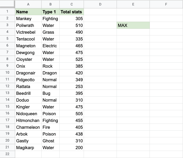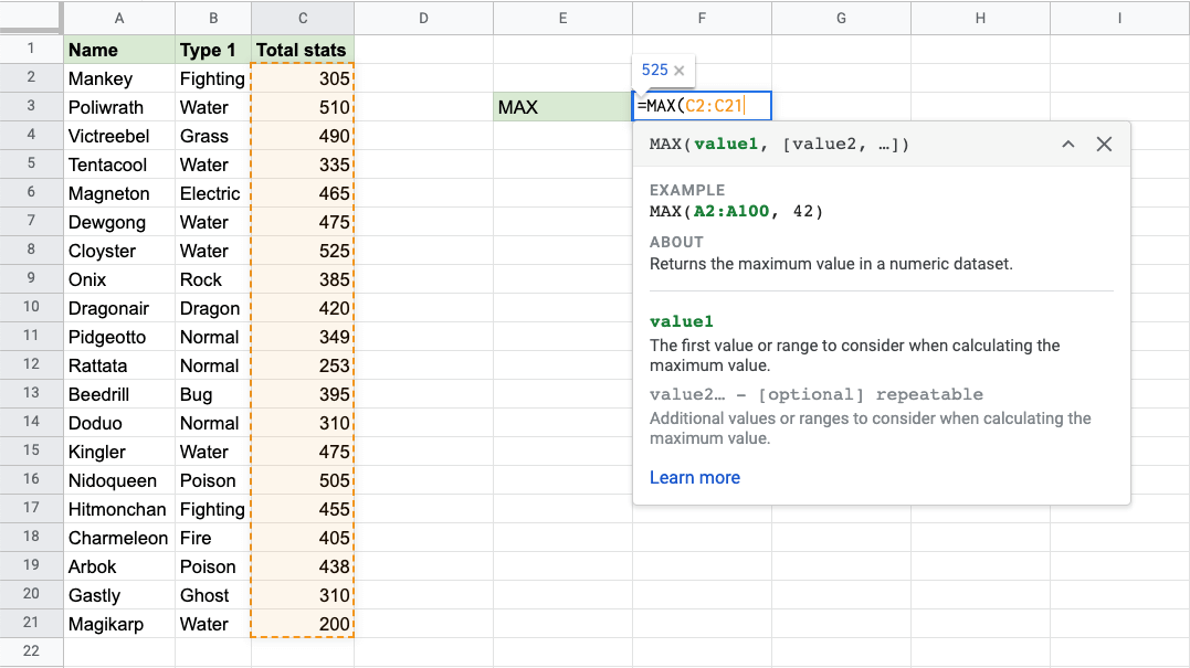 Nice going. The function ignores the text typed in the range. 510 is returned as the new highest value, since the old one was replaced with text. Poliwrath is now the Pokemon with the highest Total stats in the range C2:C21.