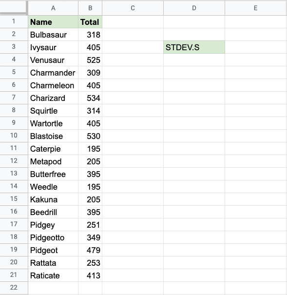 1. Specify the range B2:B21 for the Total stats for the sample Pokemon