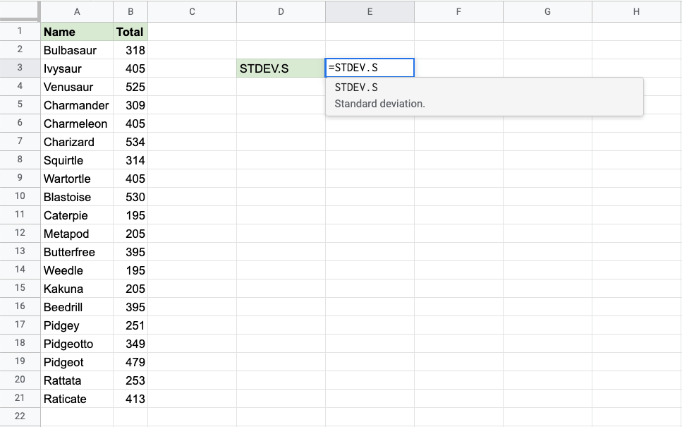 The STDEV.S function is a premade function in Google Sheets, which calculates the Standard Deviation (Stdev) for a sample of a population.