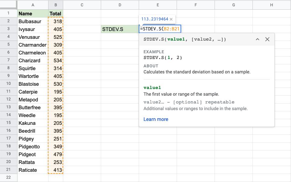 The STDEV.S function has successfully returned the Standard Deviation for the sample as 113,2319464.