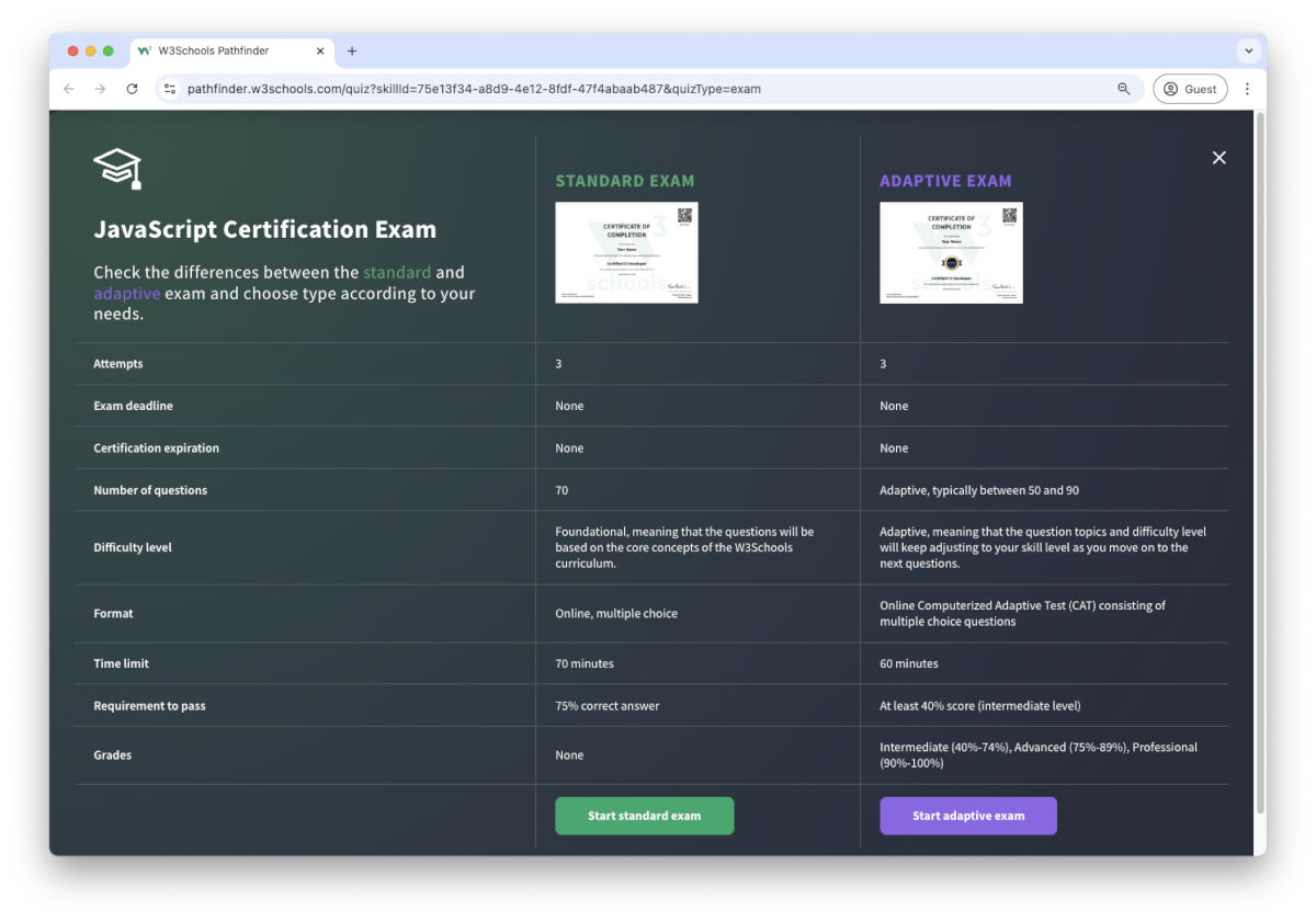 The JavaScript exam is a test that summarizes the W3Schools JavaScript syllabus.