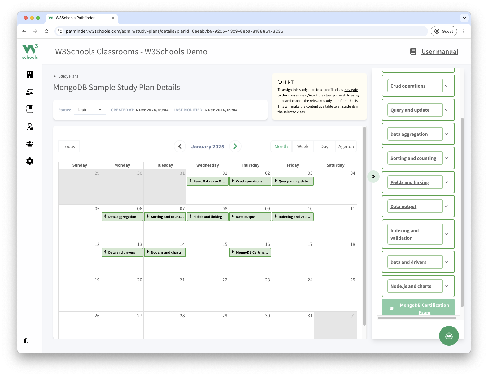 Save time with pre-built teacher materials and study plans. Easily organize your class with a timeline from the introduction of MongoDB to the final exam.