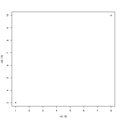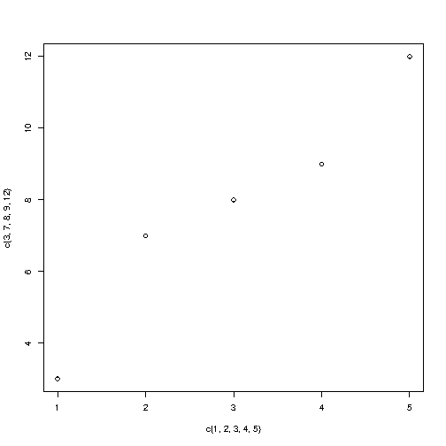 plot(c(1, 2, 3, 4, 5), c(3, 7, 8, 9, 12))