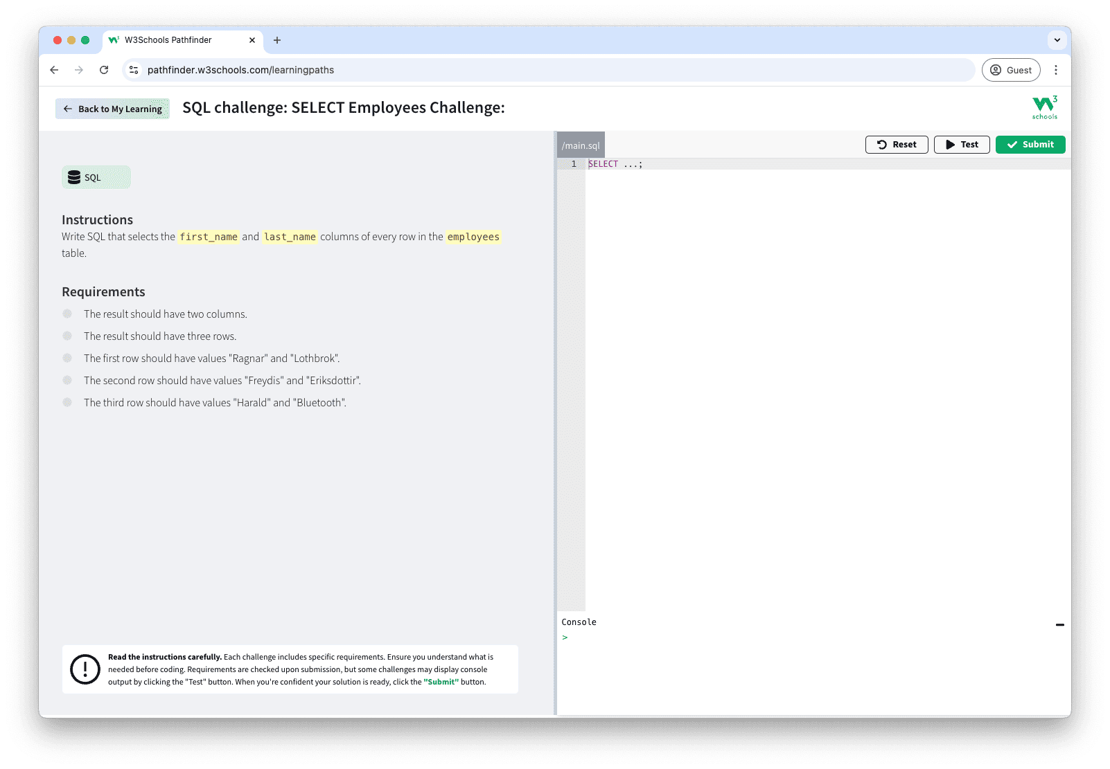 SQL is best learned by doing, and this is why we have included a lot of challenges in the course.
